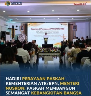 “Saudara-saudari sekalian, yang butuh Paskah, yang bangkit itu tidak hanya Yesus Kristus. Bangsa Indonesia itu juga butuh Paskah. Jadi semangat dan spiritnya Paskah itu bukan hanya spirit secara fisik. Tapi ada spirit kebangkitan secara cita-cita,” ucap Menteri Nusron dalam kegiatan yang berlangsung secara daring dan luring di Aula Kantor Pertanahan Kota Tangerang Selatan.