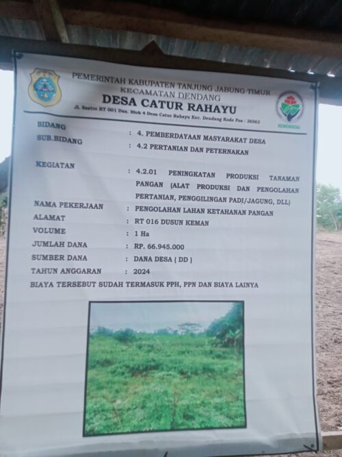 derapjambi.co_tanjabtimur – Warga RT 016 Dusun keman garap lahan Desa Catur Rahayu seluas 1 ha untuk sebagai objek Taman Perkebunan Pangan dengan Jenis Padi dan Jagung berikut mesin penggilingan produksi hasil panen nantinya. Kegiatan melalui bidang Pemberdayaan Masyarakat desa sektor Pertanian dan peternakan.