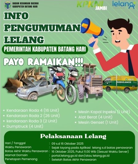 Pemkab Batanghari menghimbau kepada seluruh masyarakat untuk ikut berpartisipasi dalam proses lelang ini secara tertib dan sesuai ketentuan, serta menjadikan kesempatan ini sebagai sarana memperoleh kendaraan dengan harga kompetitif dan proses yang transparan.