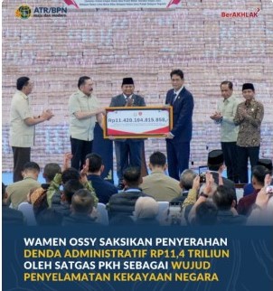 “Mewakili Bapak Menteri Nusron, menghadiri acara penyerahan denda administratif yang dilakukan Satgas PKH dengan nilai sekitar Rp11,42 triliun. Bersyukur dapat melaksanakan apa yang menjadi harapan Bapak Presiden, harapan dari masyarakat, agar kekayaan negara serta sumber daya alam yang kita miliki ini bisa sebesar-besarnya dimanfaatkan untuk rakyat,” tutur Wamen Ossy di Komplek Kejaksaan Agung, Jakarta, usai kegiatan berlangsung.