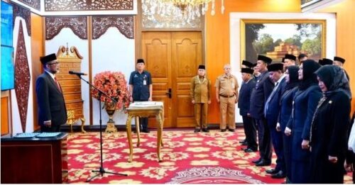derapjambi.co_jambi – Sekretaris Daerah (Sekda) Provinsi Jambi, Dr. H. Sudirman, SH, MH., melantik sekaligus mengambil sumpah/janji jabatan Pejabat Administrator, Pejabat Pengawas, serta Pejabat Fungsional di lingkungan Pemerintah Provinsi (Pemprov) Jambi. Pelantikan tersebut berlangsung di Rumah Dinas Gubernur Jambi dengan suasana khidmat, Selasa (09/09) pagi.